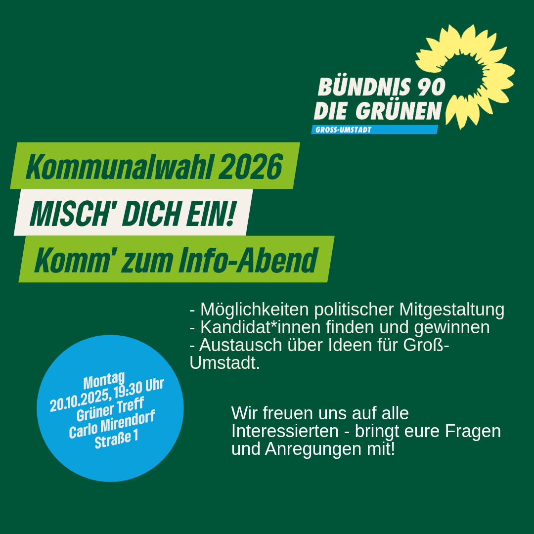 Am 15. März 2026 stehen die Kommunalwahlen an – und DU kannst Teil des grünen Wandels werden! Wir suchen engagierte Menschen, die ihre Ideen für ein nachhaltiges und lebenswertes Groß-Umstadt einbringen möchten.